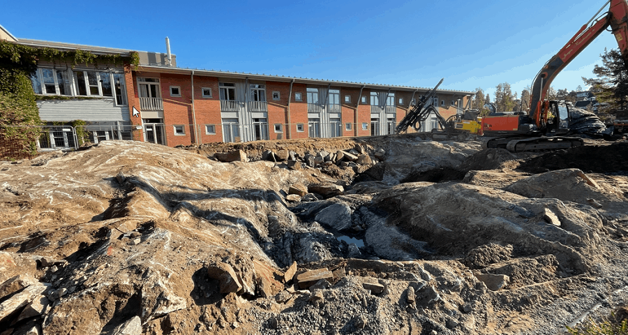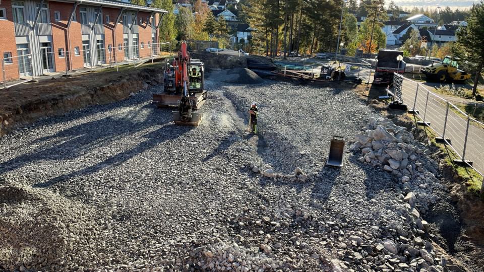 Sprengningsarbeidet er nå unnagjort. Vi håper at det ikke har vært til for stor sjenanse for senterets brukere og naboer. Ut over i september vil de være ferdig med grunnarbeidet før støyping av sålen kan komme på plass og selve byggingen starter. I november desember skal bygget stå såpass ferdig at taket vil være på plass.