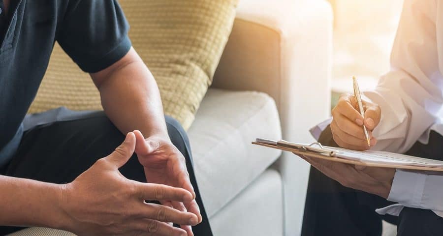 Doctor consulting male patient, working on diagnostic examination on men's health disease or mental illness, while writing on prescription record information document in clinic or hospital office